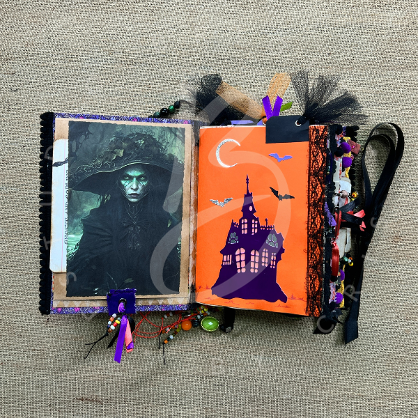- Páginas coloridas, enfeitadas com caveiras, fantasmas, retratos de bruxas, imagens de Halloween, bolsos, envelopes, carimbos....um mundo maravilhoso de enfeites!